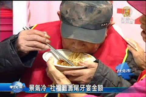 【新唐人亞太台2013年1月8日訊】景氣不好,社福團體募款最受衝擊。每年都會募款籌辦街友、獨居老人尾牙宴的華山創世基金會,今年預定在2月5日,全台同時舉行14場,但至今募款金額卻仍只有原訂目標的四成。基金會今天說,尾牙宴還是會咬牙辦下去,但給街友的紅包確定又要縮水了。