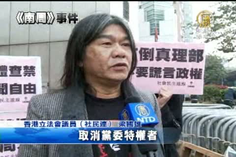 香港立法會議員(社民連) 梁國雄:「他們受到中宣部的壓制,是全體媒體受到中宣部的壓制。我們要求中共停止壓迫新聞記者,尊重新聞自由,取消黨委特權者。媒體不應該由黨委控制。」