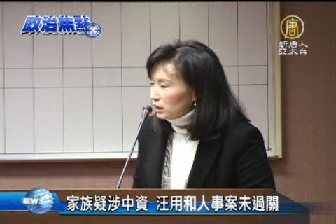 【新唐人亞太台2013年1月10日訊】立法院交通委員會今天審理NCC委員候選人汪用和及江幽芬的人事遞補案,結果下午出現大逆轉。民進黨立委管碧玲踢爆汪用和的遠房叔公汪潮涌在中國 的信中利集團 擔任總裁,還協助汪用和的父親汪大華創立新中國際集團並擔任大股東,指這兩家公司關係密切,由於信中利集團跨足文化傳媒、信息科技,汪用和恐怕成為具有中國創投背景的「人頭」,身分嚴重不適合擔任NCC委員。經過朝野協商後,交委會決定,暫緩汪用和人事遞補案的審查,讓汪用和先行離席,僅江幽芬審查過關。