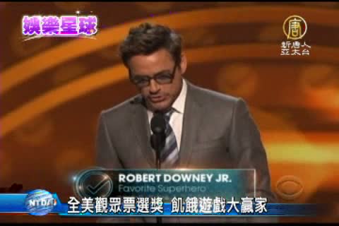 【新唐人亞太台2013年1月11日訊】2013年全美觀眾票選獎9日晚間公布頒獎結果。浩劫後動作片電影《飢餓遊戲》是本屆大贏家,抱走包含年度最佳電影在內五項大獎。凱蒂佩芮則再次於音樂獎項中拔得頭籌。