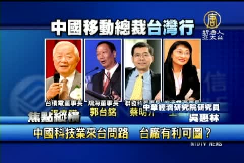 【新唐人亞太台2013年1月15日訊】2009年,中國大陸3G開台,中國移動苦無3G終端設備,當時的總裁王建宙,還曾來台拜會科技大老,積極與台灣廠商聯手,讓中國大陸3G通訊快速發展,而這次,李躍來台參加的論壇,與會人士方面做了相當嚴格的規定,只限IC零組件、測試認證、網通、系統整合等台灣通訊產業高層主管參與。中國科技業對台動作頻頻,是台灣廠商的商機?還是像立委擔心的,有國安隱憂?今天的焦點縱橫,為您解析。