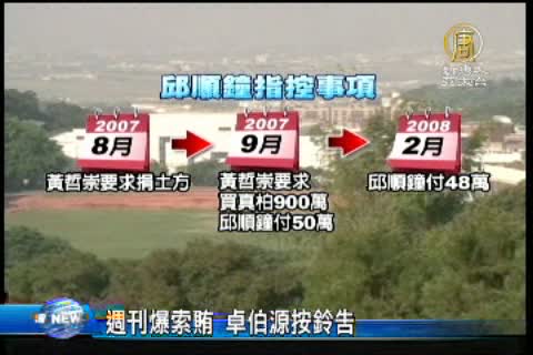 【新唐人亞太台2013年1月16日訊】彰化縣長卓伯源的胞弟卓伯仲涉弊,被收押禁見,現在火燒到了卓伯源身上,因為前中華民國高爾夫球協會副理事長,邱順鐘,向週刊爆料,卓伯源以拒絕發給彰農高爾夫球場雜項執照,來做為要脅,透過兩名白手套,向申請人邱順鐘索賄1.2億元,不過,卓伯源快動作按鈴告邱順鐘,指這是抹黑行動。