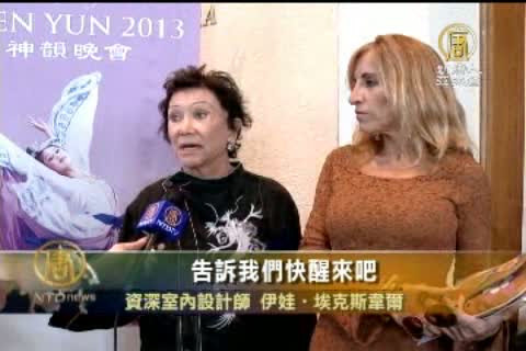 【新唐人亞太台2013年1月16日訊】喜好中華文化和美食的資深室內設計師伊娃‧埃克斯韋爾觀看了,美國神韻國際藝術團日前(13日)在佛州勞德代爾堡市的最後一場演出表示,神韻在喚醒人們的良知。也有觀眾表示,很慶幸能找到在中國已經失去的傳統文化。