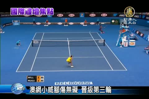【新唐人亞太台2013年1月18日訊】澳洲網球公開賽,女單賽事中,白俄羅斯女將艾薩蘭卡以直落二,輕鬆擊敗希臘選手晉級。美國女將小威廉絲先前雖然腳踝扭傷,但仍然順利擊敗對手晉級。而男單方面,法國好手第七種子宋嘉對戰日本選手勝出,挺進第三輪。