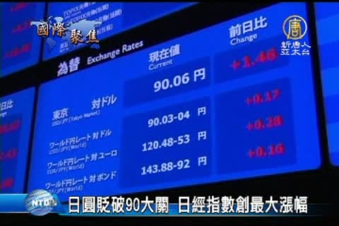 【新唐人亞太台2013年1月19日訊】繼續是有關日本的消息。亞太股市週五(18日)收盤全線走高,日經指數出現22個月來單日最大漲幅,因日圓兌換美元匯價貶破90日圓關卡,為2010年6月來首見,進一步擴大了出口商獲利前景能見度,日經指數週五也出現22個月來單日最大漲幅,收漲近2.9%。