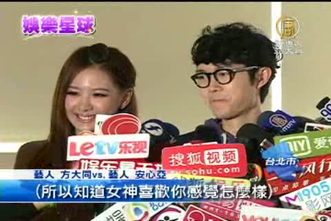 藝人 方大同vs.藝人 安心亞:「看他的眼睛( 可以互相注視嗎),是我不敢看吧,(深情對望一下)。哈哈,(所以知道女神喜歡你感覺怎麼樣)非常開心也知道她,有時間她也會來看音樂會,很感謝她今天也出來幫我打氣,然後餵我喝湯。」