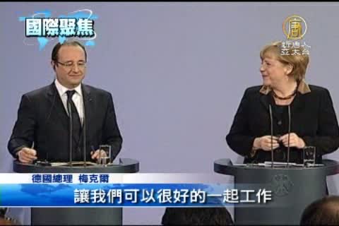 【新唐人亞太台2013年1月23日訊】1963年,法國和西德在1月22日這天簽訂象徵和解團結的艾里賽條約,至今正好五十週年,法國總統歐蘭德22日前往柏林,與德國總理梅克爾會合,參加一系列紀念活動,兩人展現團結,並表示將在5月之前共同提出歐元改革方案。