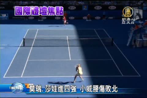【新唐人亞太台2013年1月23日訊】澳網已進入四強爭霸戰,星期三(23號)莫瑞擊敗法國選手查迪,拿到準決賽門票。莎拉波娃也在星期二的比賽揮下俄羅斯馬卡洛娃挺進準決賽。小威廉斯則因腰傷,被同胞19歲小將斯蒂文斯擊敗,無緣四強,自上賽季起的20連勝紀錄也告終結。