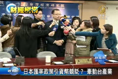 【新唐人亞太台2013年1月25日訊】日圓匯率今天創下2年半來新低,目前跌到90.654日圓對一美元。德國、英國央行、瑞士聯合銀行(UBS)等各國已經紛紛表示譴責,擔憂日本的貨幣政策可能引發新一輪匯率戰爭。現在大家都關心,究竟日圓持續看貶,會不會影響到台灣產業?今天,台灣經濟研究院,以及企業界,都有發表看法。
