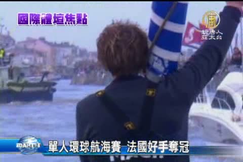 【新唐人亞太台2013年1月28日訊】經過7個多星期的航行,法國旺底不靠岸單人環球航海賽終於在27號決出分曉。法國船長勒克拉克的「大眾銀行」號以78天5小時33分52秒的成績勇奪冠軍。一樣來自於法國,葛伯特的「馬賽福」號隨後抵達獲得亞軍。