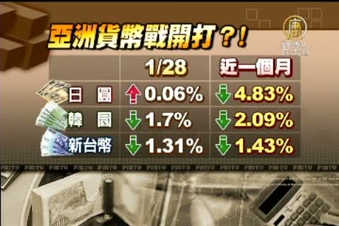 【新唐人亞太台2013年1月29日訊】來關新財經消息。央行總裁彭淮南暗示亞洲貨幣戰全面開打,今天日圓和韓圜的匯率走勢,出現回穩緩和的跡象,新台幣兌換美元雖然一度貶值1角,不過又逐漸收斂,在29.6元附近震盪,但是外匯策略師認為,外資撤離的趨勢仍在,短期內,亞洲貨幣還有貶值的壓力。