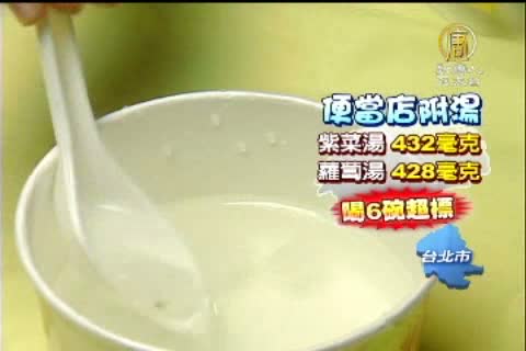 如果加上豬肉沾醬吃,鈉更多,一鍋就逼近3000毫克,冬天銷路很好的關東煮,麻辣口味,鹽巴下手也很重,200毫升,就有1062毫克的鈉,喝兩碗,就超標。便當店,免費附贈的蛋花湯、蘿蔔湯,一小碗就400毫克的鈉。