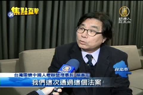台灣關懷中國人權聯盟理事長 楊憲宏:「對法輪功成員來說,我們覺得最擔心的是,不曉得哪個地方又有活摘器官的問題,那如果我們每天都知道,他仍然健在,活著,在那個地方,他的身高體重如何,連這些數字我們都有的話,我們就確保他不會隨便就被殺掉,我覺得這個就是通過這個法案很重要的部分」
