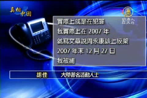 大陸著名活動人士 胡佳:「他所統攝的公安、法院、檢察院、司法警察,包括勞動教養,還有監獄警察、國家安全、信訪,這些機構每天的運轉,實際上就是在犯罪。我實際上在2007年就寫文章,說周永康該上絞架,2007年末12月27日我被捕,後來08年被判煽動顛覆國家政權罪的時候,關於指責周永康應該上絞架,死有餘辜這類的話,成為給我定罪的證據之一。」