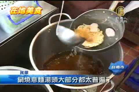 【新唐人亞太台2013年2月8日訊】在台南一說到意麵,就會讓人聯想到鍋燒意麵,不過這個意麵與南投意麵有所不同,麵體呈現塊狀式,是用油炸而成,在民族路上有一家半世紀的鍋燒意麵老店,到了用餐時間,滿滿的排隊人潮,到底台南這家鍋燒意麵有什麼吸引人的地方?馬上帶您一起去品嘗。