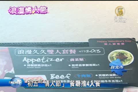 【新唐人亞太台2013年2月14日訊】西洋情人節遇上過年不只是花店買氣受影響。由於情人節剛好就在連續假期的中間,有飯店業者乾脆就不推情人節套餐了,當然也有餐廳業者,除了浪漫的情人節套餐之外,還特別推出了4人套餐,歡迎親友結伴糾團過節。