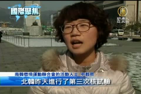 南韓環境運動聯合會的活動人士 申載恩(Shin Jae-eun):「北韓昨天進行了第三次核試驗,這個核試驗對在該地區生活的人們可能是一種危機,並會造成嚴重的生態災難。因此,我們強烈譴責它。」