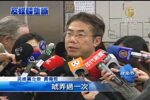 民進黨立委 黃偉哲:「執政黨到底只是喊爽的還是他們真的是對於這個反媒體壟斷真的有心來做,過去我們已經被吳育昇書記長唬弄過一次,那這次到底是玩真的玩假的就看執政黨誠意。」
