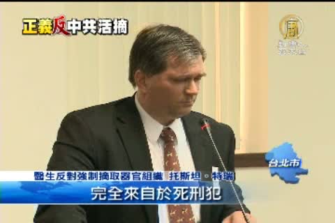 【新唐人亞太台2013年2月27日訊】從醫學專家角度來揭露中共血腥活摘器官的《國家掠奪器官》一書的編輯,「醫生反對強制摘取器官」組織(DAFOH)的執行長托斯特醫生,以及該書的醫學及法律專家共五位受邀來台,今天(27日)共同前往立法院,向與會的立法委員說明中國器官不法來源問題,以及如何調查出中共活摘器官,並分享順應國際潮流的國家立法經驗。出席的立委表示,將順應國際趨勢,推動修法,擴大器捐,防止民眾到境外做移植,出席的還有健保局長及衛生署企畫處長,共同與國外專家互動。