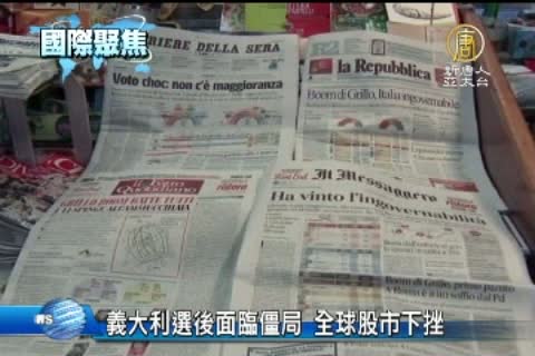 【新唐人亞太台2013年2月27日訊】義大利國會大選結果出爐,參議院的選舉部分,幾乎沒有贏家,沒有一個政黨佔明顯多數。原本這一次義大利全國大選,目的在進一步推動經濟改革,但這種沒有贏家的選舉結果,可能再次造成政治僵局,影響歐洲金融穩定,而這使得這兩天歐、亞、美的股市全面下跌。