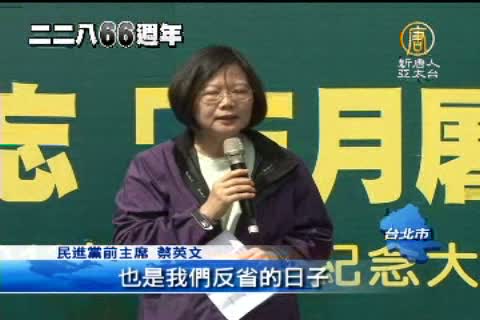 【新唐人亞太台2013年2月28日訊】接著來看到民間的二二八紀念活動,本土社團在台北舉辦「勿忘3月屠殺」大遊行,民進黨主席蘇貞昌到場致詞,除了再次要求還原真相,也指出,國民黨必須為賠償228事件的受難家屬負責。