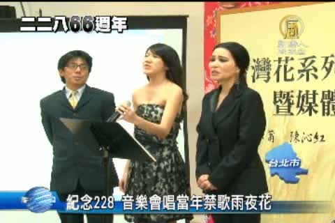 【新唐人亞太台2013年2月28日訊】228紀念日滿66周年,台師大教授以古典室內樂方式,將台灣早期與花有關的民間歌謠重新譜曲,並在228前夕舉辦台灣花系列歌謠音樂會,帶領台灣人重溫當年的感動。音樂會現場也邀請歌手潘越雲,現場演唱當年的禁歌<雨夜花>。