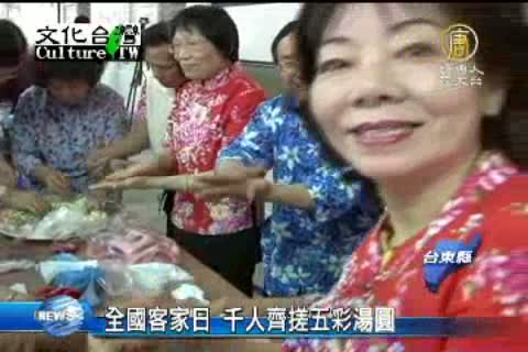 【新唐人亞太台2013年3月1日訊】黃曆1月20日,是全國客家日,相傳這一天也叫做天穿日,女媧用五彩石頭補天,台東縣政府特別邀請民眾到台東糖廠,一起搓五彩養生湯圓,現場還有社團表演,有吃又有玩。
