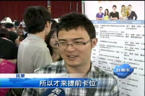 求職現場熱鬧滾滾,求職者不是埋頭寫履歷,就是拿著履歷到處面試,南區就業博覽會在成大登場,總共有168家廠商提供超過1萬個工作機會,許多在校生還沒畢業就積極面試,提前為即將脫離的學生生涯找後路!