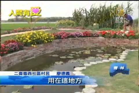 【新唐人亞太台2013年3月26日訊】雲林二崙崙西社區 有一群老人志工, 他們每天相聚在一起,從清晨到黃昏,有的種菜,有的當木工、水泥工,還有84歲的老奶奶,搬起磚塊的那股勁,完全不輸年輕人,這群志工共同為綠化社區努力,把原本雜草叢生的荒地,打造成美麗的綠園,他們說他們越做越年輕,越開心。