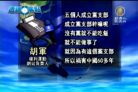 「權利運動」網站負責人 胡軍:「我還說,這就是屬於習近平說的那句話,吃飽了撐著沒事幹!共產黨就是幹這荒唐可笑的事情,我們還能說甚麼呢?五個人他要成立黨支部,成立黨支部幹嘛呢﹖沒有黨就不能吃飯?就不能做事了?就因為有這個黨支部,所以禍害中國60多年!」