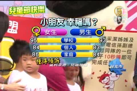 【新唐人亞太台2013年4月4日訊】全台慶祝兒童節。兒福聯盟就針對10到12歲的兒童做調查,發現有兄弟姊妹的孩子幸福感較高,其中女孩的幸福分數又高於男孩,原因是女孩較願意訴說心事、煩惱,所以幸福感較高。