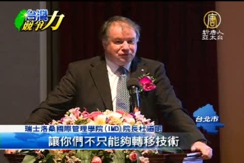 【新唐人亞太台2013年4月5日訊】瑞士洛桑國際管理學院院長杜道明來台,日前在一場演說上,為台灣競爭力把脈,去年該機構評比的全球競爭力排名,台灣世界第七,比2011年退步一名,他讚賞台灣的企業精神,卻也提醒台灣,要想辦法吸引外資,開拓新興市場,不要過度依賴中國大陸。
