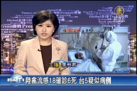 【新唐人亞太台2013年4月7日訊】世界衛生組織(WHO)最新疫情公布,中國大陸H7N9禽流感,截至目前,確診病例總共18例,上海8例、江蘇6例、安徽1例、浙江3例,其中6人死亡,10人病情嚴重。衛生署疾管局表示,從6日中午至7日中午為止,台灣總共通報5例疑似病例,包括來自上海、江蘇的返國旅客,其中3人已確定與H7N9無關,但仍有2例檢驗結果尚未出爐。目前已派出兩名流行病學背景的醫師,抵達上海,了解H7N9禽流感疫情,但兩人的身分暫時不公開。