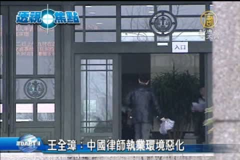 【新唐人亞太台2013年4月8日訊】中國23個省市近140名律師,4月5號向中華全國律師協會、北京市律師協會和江蘇省靖江市法院發出《建議信》,要求靖江當局暫停對北京維權律師王全璋的司法拘留。4月6號王全璋被「提前解除拘留」,他向本台記者表示,他被拘留並非個人恥辱,而是「中國司法系統和法院的恥辱」,更是中國執業律師環境惡化的一個縮影。