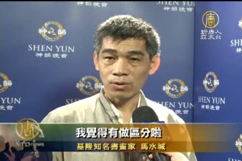 【新唐人亞太台2013年4月12日訊】美國神韻巡迴藝術團3月21日晚間在基隆市文化中心的演出,吸引許多基隆在地的藝文界人士,知名書畫家馬水城驚歎,神韻節目貫穿中國歷朝歷代。另一位有著船長詩人稱號的林福蔭,也以一首詩,表達神韻所呈現的精神價值與力量。