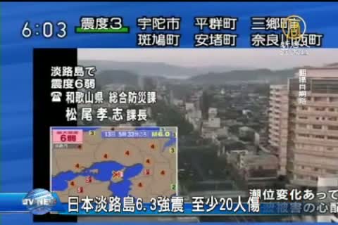 【新唐人亞太台2013年4月13日訊】日本在今天,又發生強震。今天清晨五點30分,在兵庫縣淡路島附近,發生芮氏規模6.3的強震。大約有20人受傷。這是關西地區從1995年阪神大地震以來,首次觀測到震度6以上的地震。首相安倍晉三立即向內閣危機管理監米村敏朗下達指令,要求盡全力救助災民,確認災害資訊,做到萬無一失。