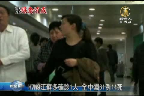 【新唐人亞太台2013年4月15日訊】新聞頭條,先來帶您關心,中國大陸H7N9禽流感,又爆出新的確診病例。中國江蘇省衛生廳稍早公布,新確診1人感染H7N9禽流感,目前病情嚴重。新確診患者是一名60歲男子,居住在昆山市,目前正在蘇州一家醫院救治,而3名與他有密切接觸的人,目前沒有異常。此外,南京市一名77歲女患者,昨晚經搶救無效死亡。目前全中國已經有61人確診感染H7N9禽流感,其中14人死亡。