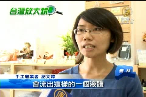 【新唐人亞太台2013年4月16日訊】醬油製作過程中,在蒸熟黑豆時會流出黑豆水,一般業者只能自己喝,喝不完就丟掉,而雲林一位手工皂業者,因為不想浪費,就把這些黑豆水都蒐集起來,製作成醬油手工皂,洗起來不但舒服不乾澀,而且還有淡淡的醬油香,相當特殊。