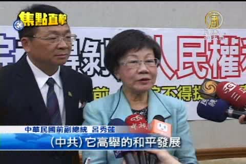 中華民國前副總統 呂秀蓮:「(那你在美國有沒有美方表達這樣的疑慮?)有,我事實上這次在美國,從西雅圖、紐約、到華盛頓都公開做了非常多場的英語演說。//(中共)它高舉的和平發展,事實上是在一步一步,遂行它的和平統一併吞台灣。」
