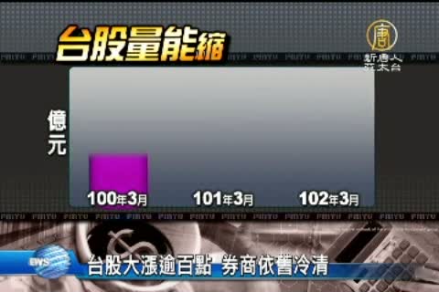 【新唐人亞太台2013年4月19日訊】德州驚爆後,美股開盤震盪走低,不過,不畏國際利空消息頻傳,台股在台積電領軍的帶動下大漲超過140點,直接衝破7900點大關,但是投資人還是觀望居多,成交量持續低迷,不少號子更是冷冷清清。