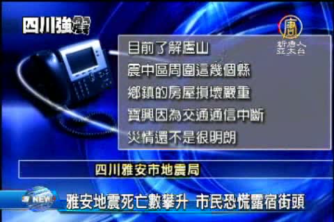 【新唐人亞太台2013年4月21日訊】4月20號早上8點,大陸四川省雅安縣發生規模7.0大地震,目前已經至少造成200人死亡,一萬一千多人受傷。從官方通報的數據看,目前傷亡人數還在不斷增加中。由於餘震不斷,雅安居民不敢停留在家中,全部露天而宿。