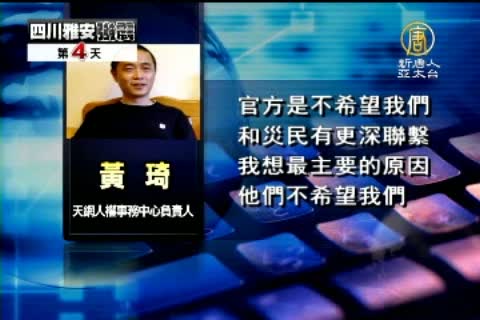 中國天網人權事務中心負責人 黃琦:「官方主要是要求我們別在這個時候跑到雅安去『添亂』,警方就明確告訴我,我們這樣前往災區去的話,對當地不利,而且警方對我們的用意和意圖是心知肚明的。明確就告訴我們,希望我們在這段時間別往災區跑,整的雙方都很不體面。」