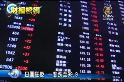【新唐人亞太台2013年4月23日訊】上週G20財長會議才結束,日本的寬鬆貨幣政策沒有在會議上受到譴責,這兩天,東京股市日經指數就攀升到了五年來的最高點。同時,日圓也一路貶值,甚至一度貶到1美元兌99.89日圓,跌破百元大關。