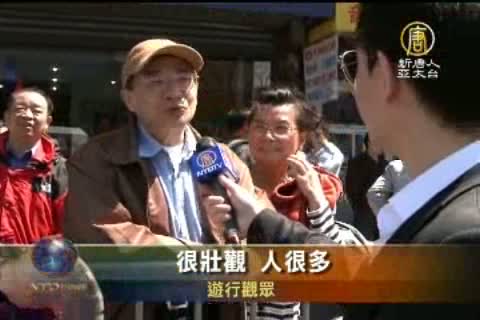 遊行觀眾:「這裡自由啊,自由國家,有冤你可以說呀。你在共產黨你有冤沒地方說呀,說了就坐牢啊。面臨坐牢不算,還面臨要死亡呢!我們是逃出來的。我跟你講,我在監獄看到法輪功,真、善、忍,我體會到的,所以我今天站出來說『法輪大法好』!」
