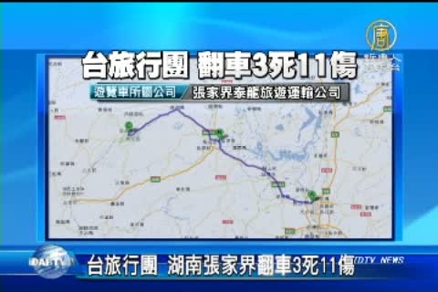 【新唐人亞太台2013年4月29日訊】台灣觀光局接獲消息,今天中午台灣雄獅旅行團,在中國大陸湖南張家界發生遊覽車翻車意外,其中3名女性當場沒有生命跡象,11人受傷送醫。今天晚上,第一批家屬已經緊急趕往長沙處理善後。