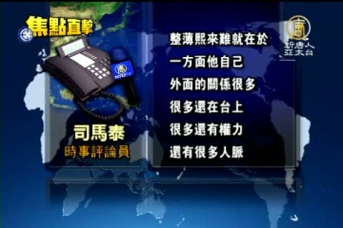 時事評論員 司馬泰:「整薄熙來難,就在於,一方面他自己外面的關係很多,很多還在台上,很多還有權力,還有很多人脈。另一方面,要治他的罪名,都能夠咬到共產黨,薄熙來把自己的罪跟共產黨本身綁到一起了。所以這就是治薄熙來很困難的地方。」