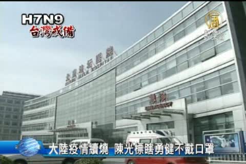 【新唐人亞太台2013年5月2日訊】繼續來關心今天的禽流感疫情。大陸禽流感疫情發燒,湖南省又多一人確診,目前已經有127人感染,26人死亡。現在台灣將大陸8個省份2個市都列入黃色旅遊警戒區,不過號稱中國首善的企業家陳光標,花了鉅資,來到台灣做健檢,卻說一點也不擔心大陸的疫情,還說,連口罩都不想戴。