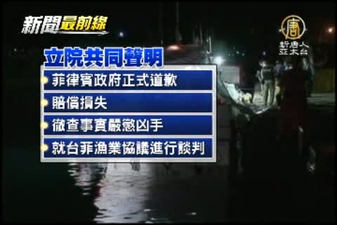 【新唐人亞太台2013年5月14日訊】廣大興28號船隻遭菲律賓槍擊事件,總統馬英九下達72小時的最後通牒,到現在為只剩下不到幾個小時,菲律賓總統艾奎諾三世卻宣稱將採一中模式進行回應,引發台灣朝野不滿。今天上午立法院各黨團聯合提出聲明,一致支持中華民國政府的四項要求,菲律賓當局如果仍然沒有回應,將採取制裁措施。