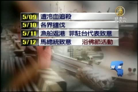【新唐人亞太台2013年5月14日訊】台灣漁船廣大興28號遭到菲律賓公務船掃射,導致船長父親洪石城喪命。菲律賓上午臨時取消對外說明記者會,讓家屬很不滿,今天,地方父母官,屏東縣長曹啟鴻也前往琉球鄉向家屬致意。