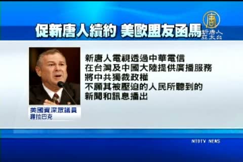 美國議員羅拉巴克也在5月10號致信馬總統與駐美代表金溥聰,他寫道,「新唐人電視透過中華電信,在台灣及中國大陸提供廣播服務,將中共獨裁政權不願其被壓迫的人民所聽到的新聞和訊息播出。」